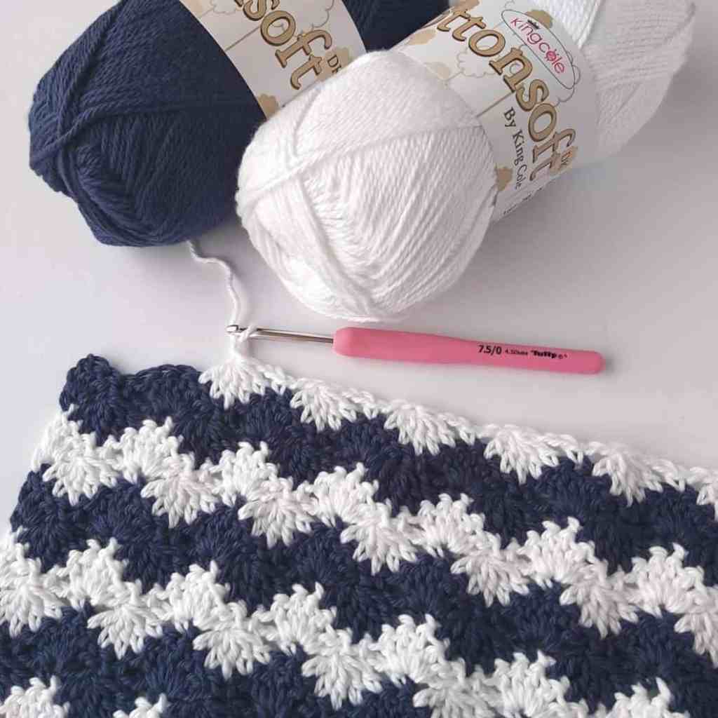This finished blanket has a simple and fresh combination of navy and white colors, and I loved the result. You'll love the texture of this free crochet pattern and the softness of the cotton thread.